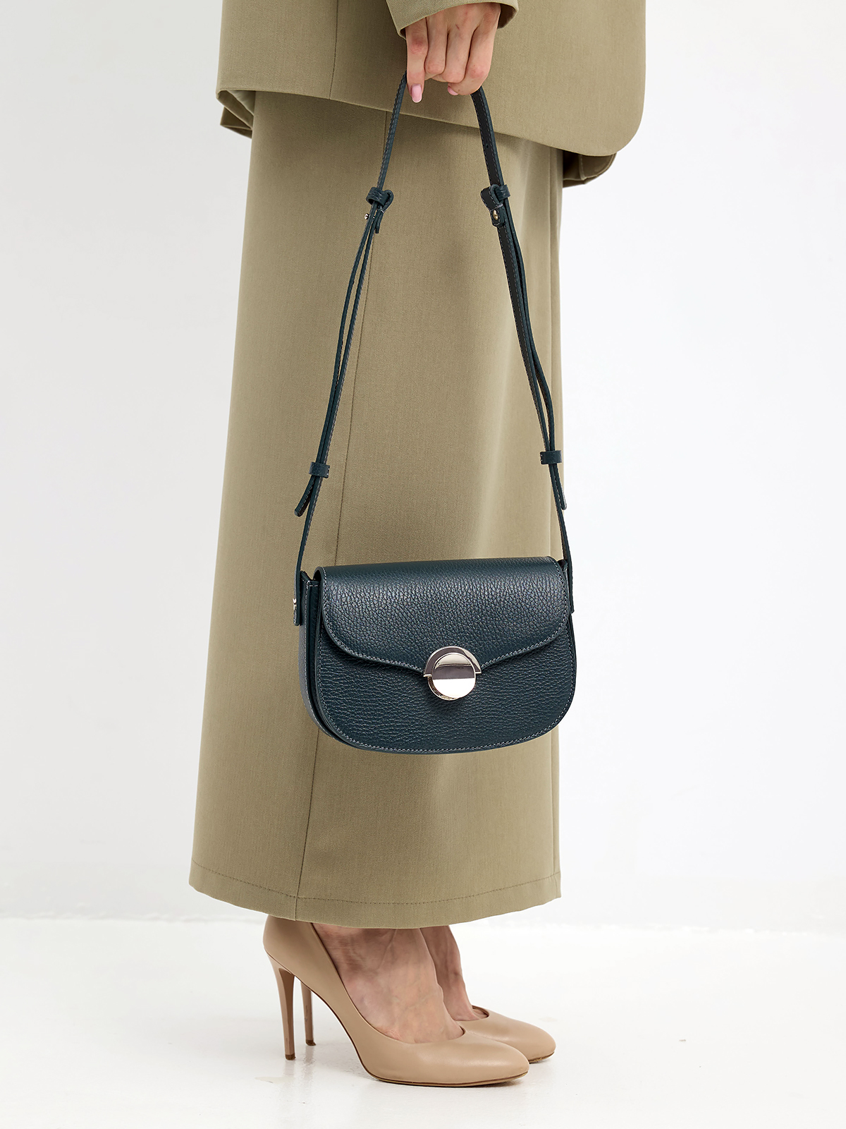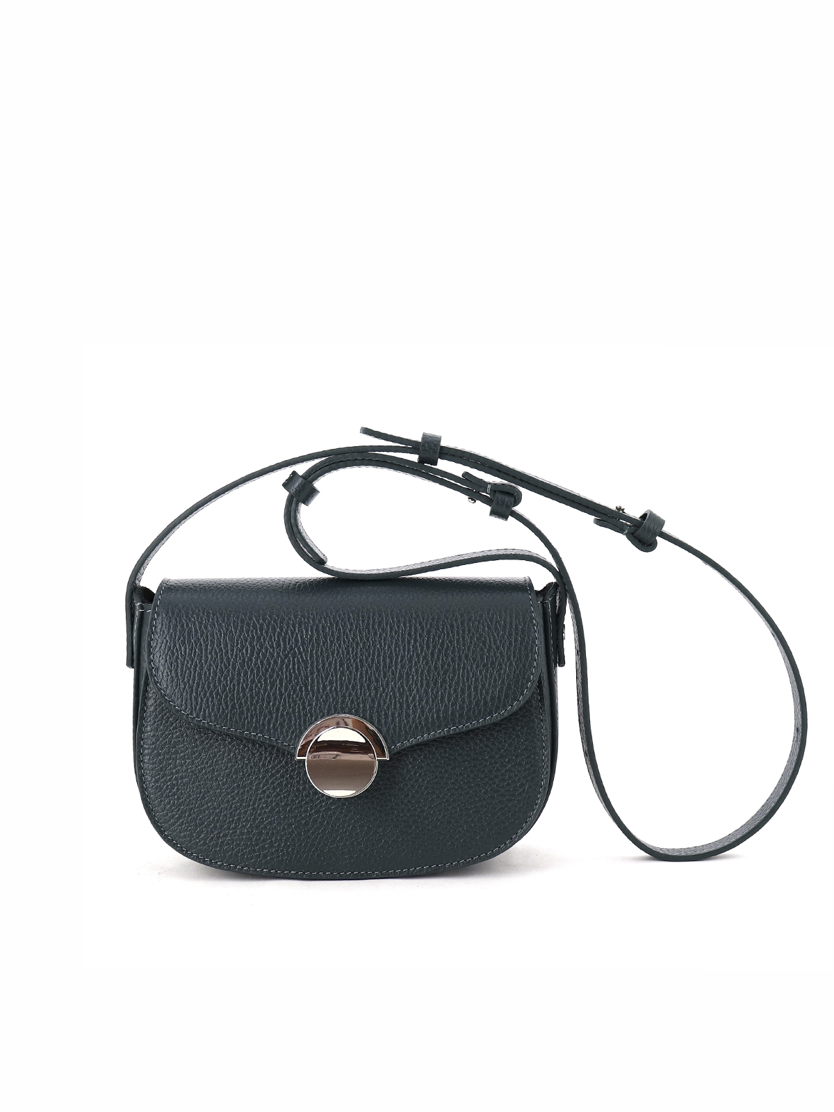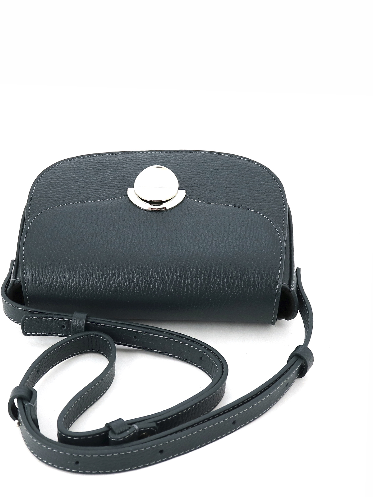 Минималистичная женская сумка красивой полукруглой формы выполнена из натуральной кожи с ярко выраженной фактурой. Стильная фурнитура добавляет индивидуальности и создает тонкий акцент в образе кэжуал. Одно вместительное отделение под клапаном на застежке внутри дополнено карманом. В комплекте кожаный плечевой ремень 130 см с регулировкой по длине. Комфортная высоким и невысоким девушкам. Небольшая компактная размеры: 19*14*8 см. (ширина высота глубина). Сумочка женская выполнена из натуральной премиальной мягкой кожи